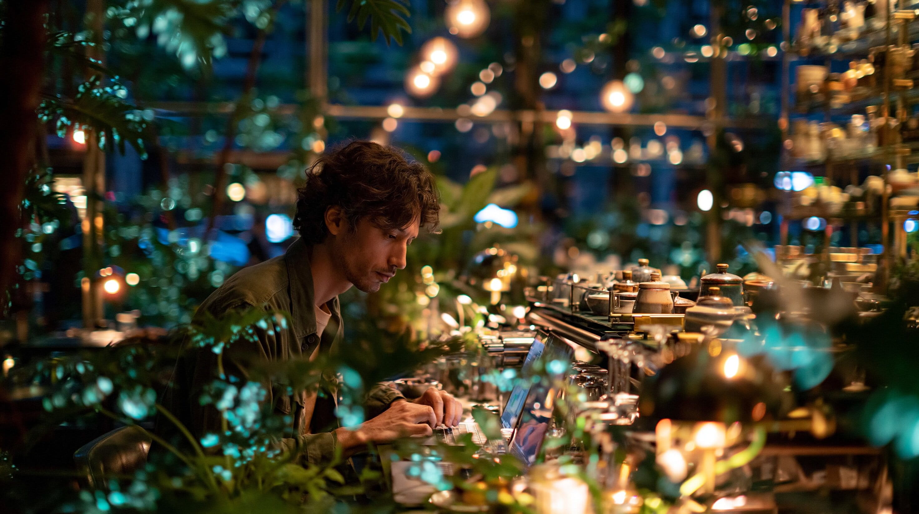 Settling in a counter chair, he hides behind the massive air scrubbing plant. Its BioLume leaves complement the café’s ambient lights. The barista is with him in no time.