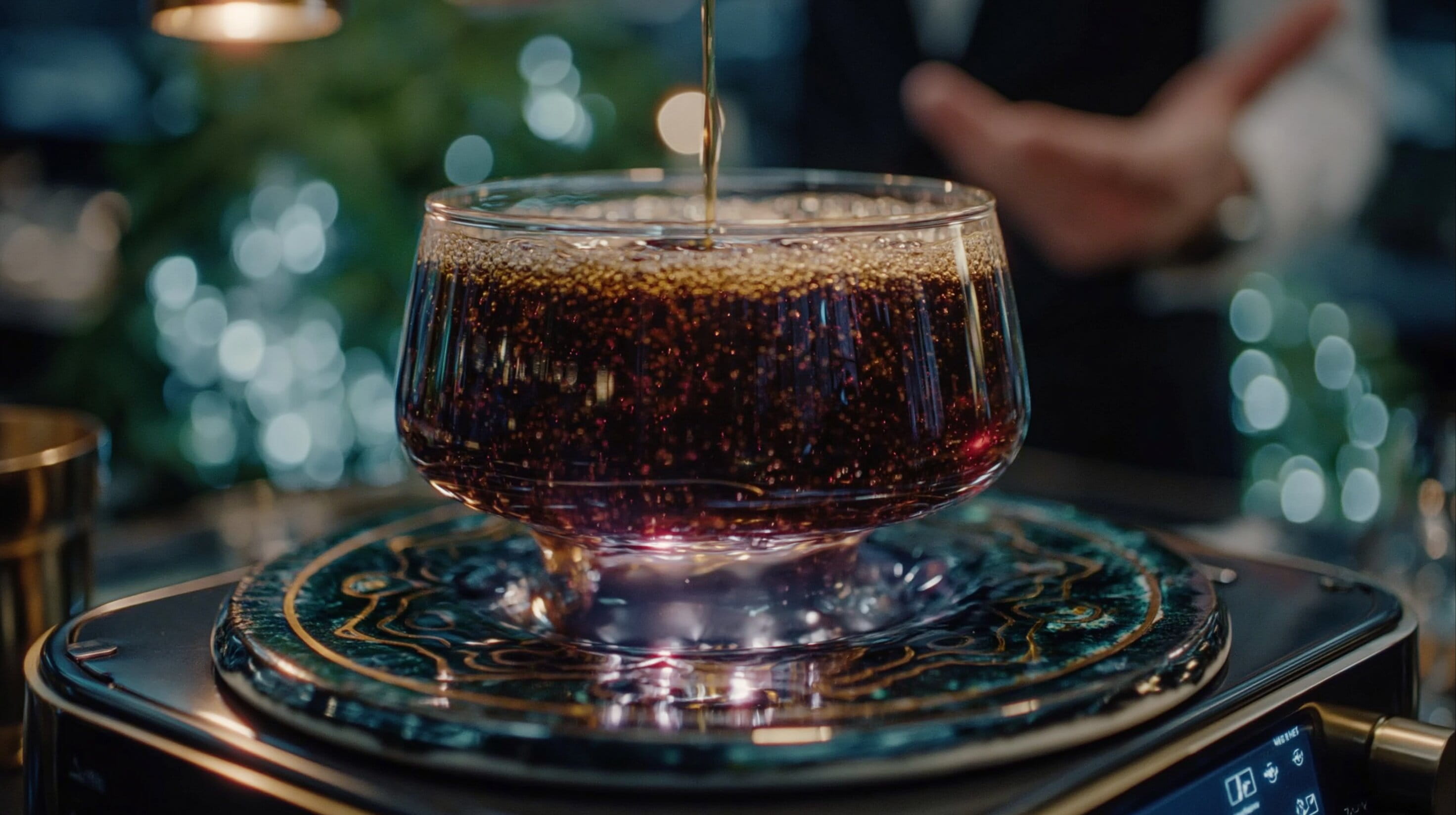 His coaster starts vibrating when the drink is poured, whipping the blend with micro bubbles into a tight vortex.